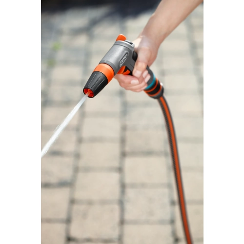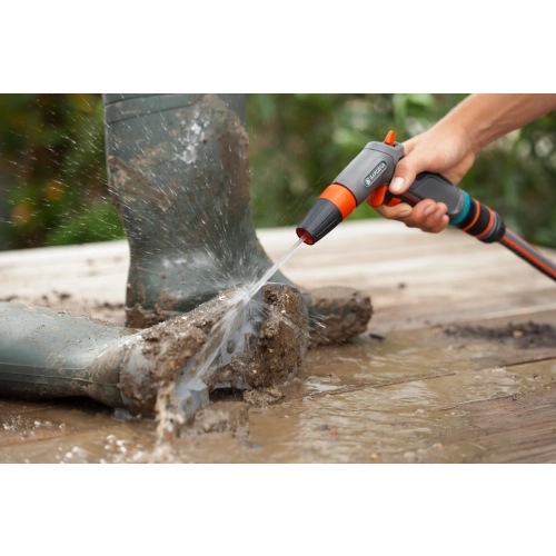 GARDENA Comfort strålepistol er velegnet til både rengjøring og vanning. Vannstrålen kan trinnløst justeres fra hard stråle til en fin tåke. Myke plast komponenter på sprøytehodet gir beskyttelse mot skade. Den har et ergonomisk håndtak av myke plastkomponenter som gir optimal håndtering og komfort ved bruk. Vanngjennomstrømmingen kan endres trinnløst. Til kontinuerlig vanning, kan avtrekkeren låses for å forhindre tretthet i hånden. Comfort stålepistolen har innebygget frostsikring.